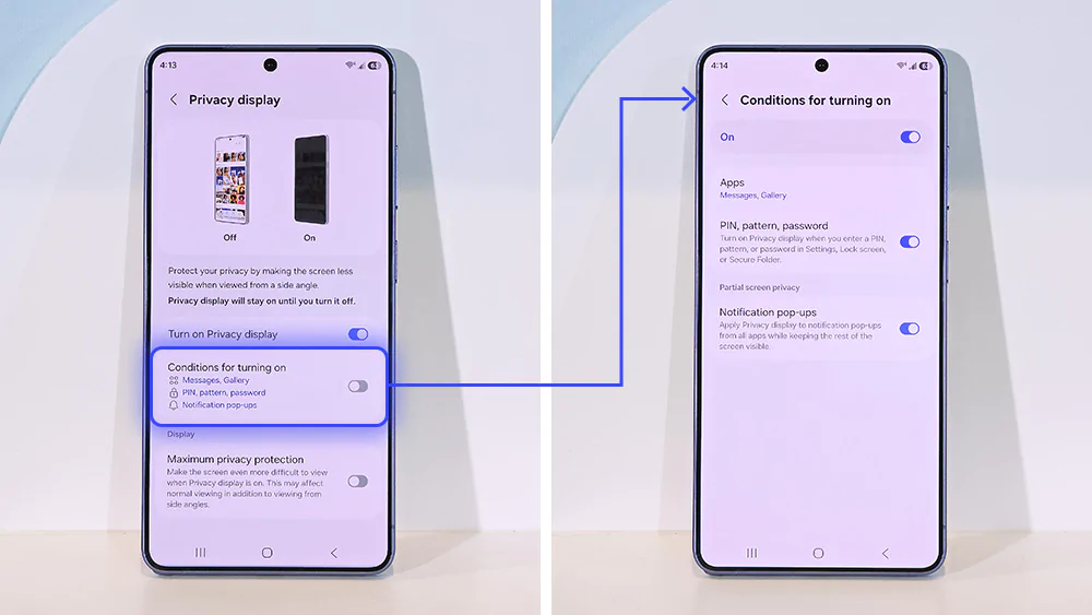 Côté écran, Samsung introduit une nouveauté marquante avec la technologie Privacy Display sur le Galaxy S26 Ultra. Celle-ci limite la visibilité de l’écran lorsqu’il est regardé de côté, afin de protéger les informations sensibles dans les lieux publics, tout en conservant une lecture optimale de face. La fonctionnalité peut être activée rapidement via le bouton latéral et s’adapte automatiquement à certaines situations, comme la saisie d’un mot de passe ou l’affichage de notifications.