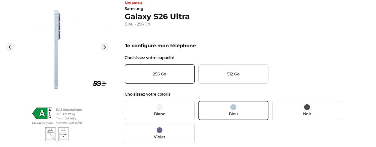 - Samsung Galaxy S26 Ultra (disponible en blanc, bleu, noir et violet) : 549€ à la commande puis 29.99€/mois pendant 24 mois avec Free Flex (option d’achat 100€)