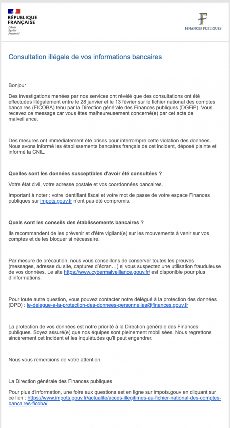 Sans surprise, le courriel officiel de la DGFiP envoyé actuellement aux victimes, confirme que leurs informations personnelles, dont leurs coordonnées bancaires, ont été consultées illégalement et appelle à redoubler de vigilance.