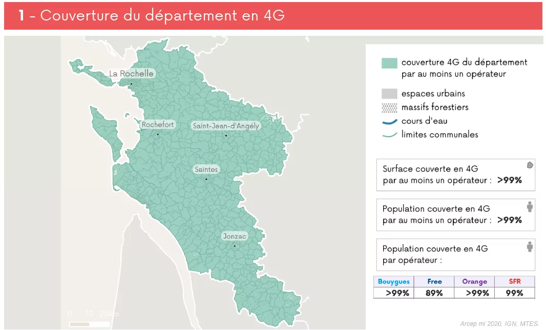“Quelle est la surface du département couverte en 4G ? Et la part de population ? Quel opérateur offre la meilleure couverture ? Quelles sont les zones couvertes par les 4 opérateurs ?”, pour répondre à ses questions que beaucoup d’élus et de Français se posent, l’Arcep lance un ensemble de cartes départementales présentant l’état actuel de la couverture 4G et sa progression ces cinq dernières années. On y retrouve la couverture par opérateur. Un état des mieux des 96 départements métropolitains présenté sous forme de cartes et de graphiques, dans un PDF synthétique, précise l’Arcep.