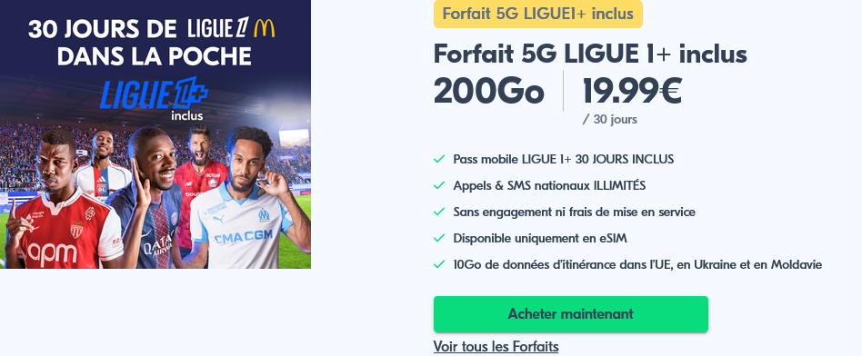 Affiché à 19,99 euros par mois, le forfait inclut 200 Go de data 5G, les appels et SMS illimités en France, ainsi que le pass mobile Ligue1+. Chaque week-end, les abonnés peuvent regarder huit des neuf rencontres de Ligue 1 McDonald’s en direct, le neuvième match étant diffusé par beIN SPORTS, ainsi qu’une rencontre en différé. Des résumés, magazines et documentaires exclusifs complètent le dispositif.