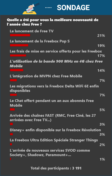 L’intégration du mVPN dans les forfaits Free Mobile ainsi que l’ouverture des migrations vers la Freebox Delta WiFi 6E recueillent chacun 7 % des suffrages, plutôt étonnant pour la 1ère nouveauté citée qui a été applaudie par la communauté lors de son lancement, un pourcentage plus élevé aurait été mérité. Ces nouveautés plus ciblées ont visiblement malgré tout trouvé leur public parmi les utilisateurs les plus attentifs aux fonctionnalités.