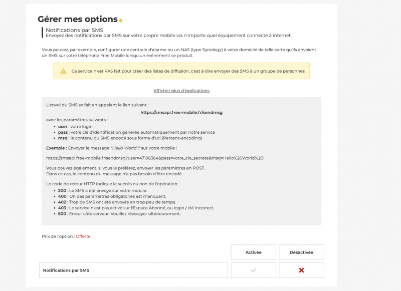 Techniquement, l’envoi du message repose sur un appel à l’adresse https://smsapi.free-mobile.fr/sendmsg avec plusieurs paramètres : le login Free Mobile, une clé d’identification générée dans l’Espace Abonné et le contenu du message. Le texte peut être transmis directement ou encodé sous forme d’URL. Une fois la requête envoyée, le serveur renvoie un code HTTP indiquant si l’opération a réussi ou non. L’activation se fait simplement depuis l’Espace Abonné Free Mobile, dans la rubrique “Gérer mes options”, où il est possible d’activer le service et de récupérer la clé nécessaire à l’envoi des messages.