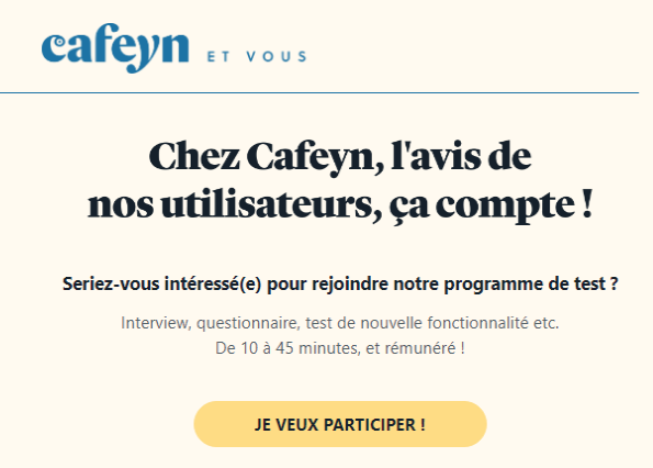 Pour participer il suffit de vous rendre sur cette page, et de donner les informations basiques pour vous recontacter (Nom, prénom, adresse mail). Ensuite vous n’avez plus qu’à attendre que Cafeyn vous recontacte pour un test ou vous proposer de répondre à une série de questions.