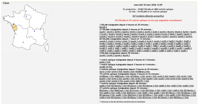 Sur Downdetector, un pic très net a été enregistré en fin de matinée avec plus de 400 signalements autour de 10h, un niveau largement supérieur à la normale. Dans le même temps, les outils de suivi de Free-réseau font état de plus de 100 DSLAM et 59 switchs optique qui ne sont pas joignables actuellement notamment en Loire-Atlantique et en Vendée. Plus de connexion donc pour certains abonnés, ni d’accès aux différents services de la Freebox, le serveur de nombreux abonnés Free reste ce matin bloqué en étape 6. Il ne s’agit pas d’une panne nationale. Un switch optique est également impacté à Paris, Lyon ou encore Amiens.