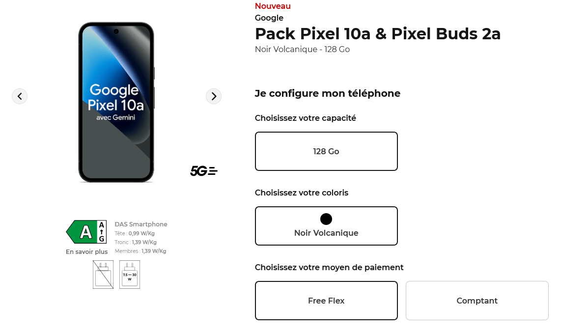 L’avantage ici est simple : l’appareil et les écouteurs ensemble se retrouvent au même prix que le téléphone seul. En effet, ce dernier est disponible pour 549€ au comptant ou 129€ à la commande puis 14.99€/mois pendant 24 mois avec Free Flex (option d’achat à 60€), soit le même tarif que celui affiché pour le Pixel 10a seul sur le site de l’opérateur. A noter cependant, seule la version 128 Go du smartphone est proposée dans le cadre de ce pack.