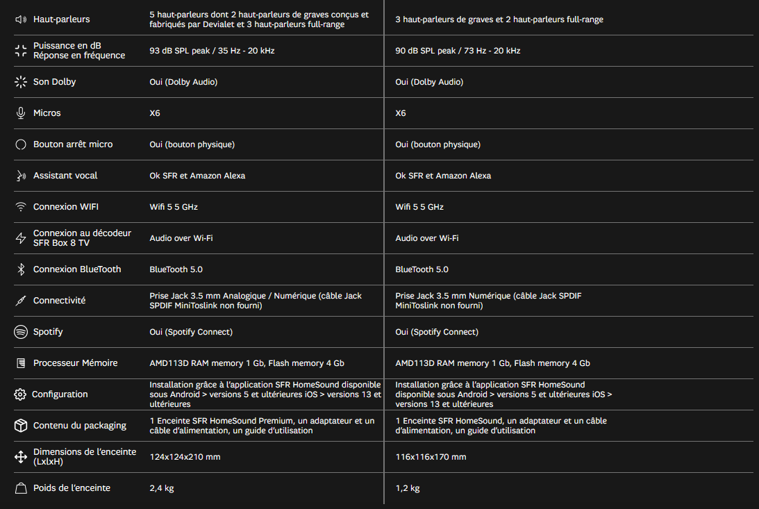Déclinée en deux versions, SFR HomeSound intègre “trois technologies acoustiques propriétaires de Devialet SAM®, SPACE et AVL pour un meilleur rendu sonore, une plus grande immersion, et un confort d’écoute ainsi que des ambiances sonores prédéfinies“. Le tout avec des hauts-parleurs multidirectionnels “haute qualité”, trois pour SFR HomeSound et jusqu’à 5 pour le modèle Premium. L’opérateur détaille les caractéristiques techniques dans un tableau comparatif sur son site web.