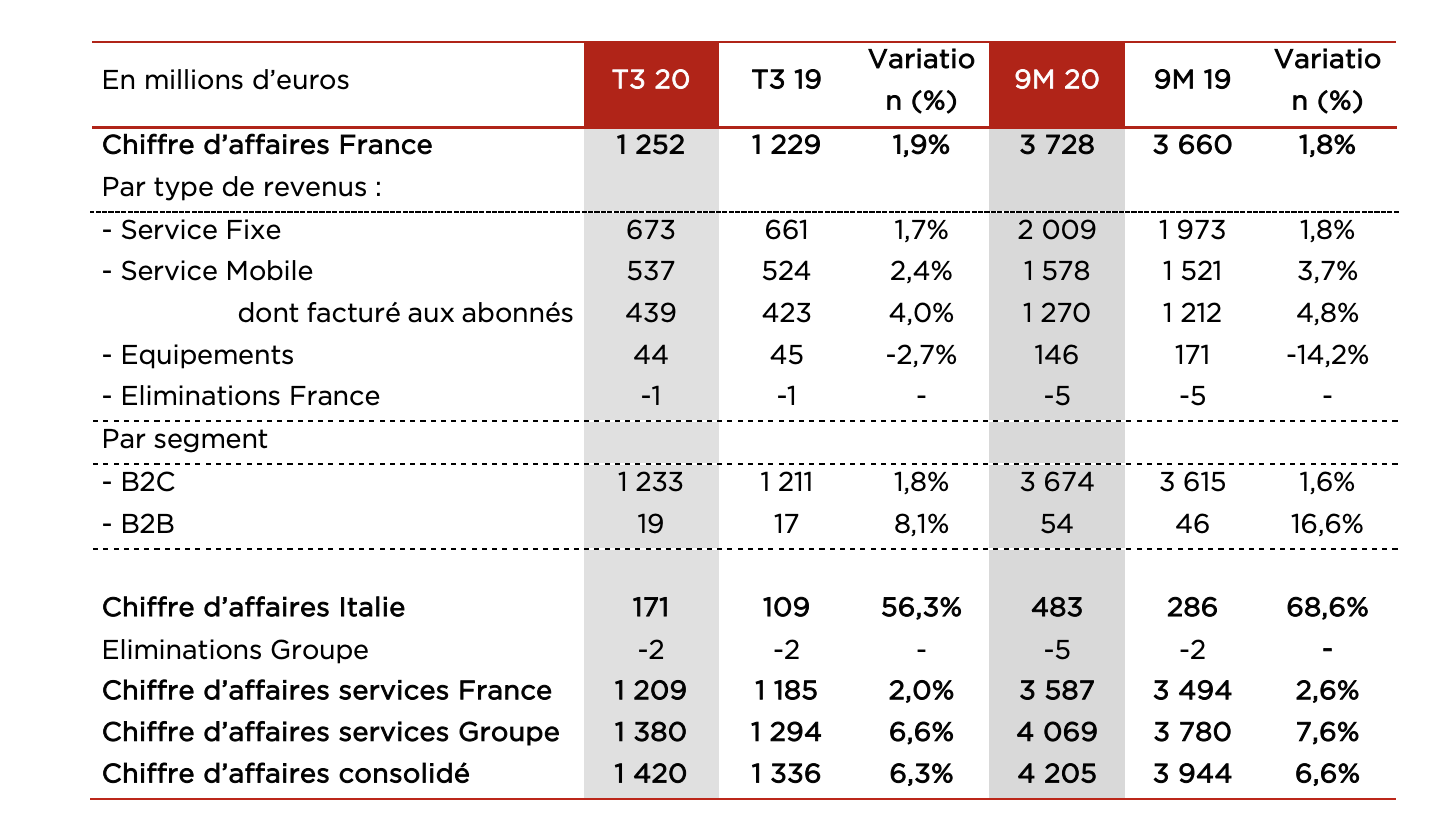 Après un impact assez léger de la pandémie sur ses comptes lors du 1er semestre, Iliad poursuit sa croissance sereinement lors du 3ème trimestre. Le chiffre d’affaires du groupe est en hausse de 6,6% sur les neuf premiers mois de l’année, “tiré par la poursuite de la bonne dynamique commerciale en Italie” soit 483 millions d’euros de revenus depuis le début de l’année et “la hausse du chiffre d’affaires services en France (+1,8%) qui absorbe la baisse des ventes d’équipements de 14,2%” , autrement dit de players Devialet, annonce-t-il ce matin lors de la présentation de ses résultats financiers et commerciaux.