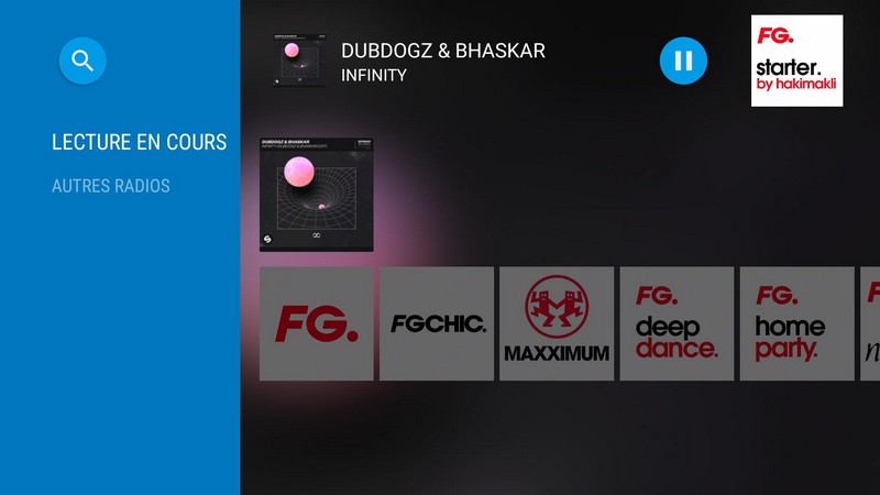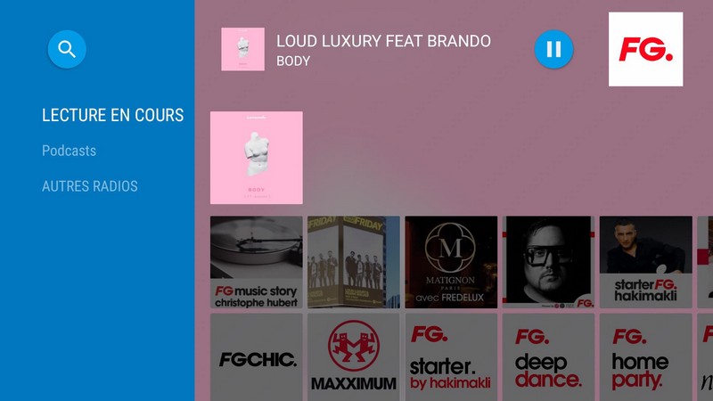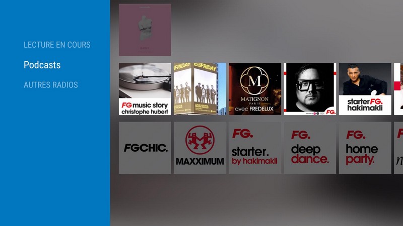 Mais elle donne également accès aux flux des différentes déclinaisons de la radio parisienne. On retrouve ainsi les canaux FG Chic, FG Deep Dance, FG Nomade ou encore FG Home Party. Une variété de styles qui permet en général de trouver son bonheur. Les amateurs de contenus plutôt commerciaux iront vers FG Starter by Hakimalki. Ceux cherchant des musiques plus calmes s’orienteront vers FG Nomade. Les fêtards devraient quant à eux trouver chaussure à leur pied avec FG Home party.