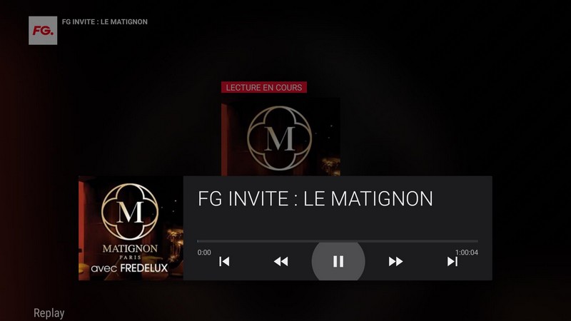 En fonction du contenu en cours de lecture, un flux en direct ou un podcast, les contrôles de lecture sont plus ou moins étoffés. Pour le flux en direct, il y a seulement un bouton de mise en lecture/pause. Lors des podcasts s’ajoutent des boutons de navigation dans le contenu, ainsi qu’une réglette pour connaître sa position dans le contenu. D’ailleurs, les boutons gauche/droite de la télécommande ne permettent pas la navigation. Il faut appuyer successivement sur les boutons retour/avance dans l’interface. Dommage, cela aurait été pratique.