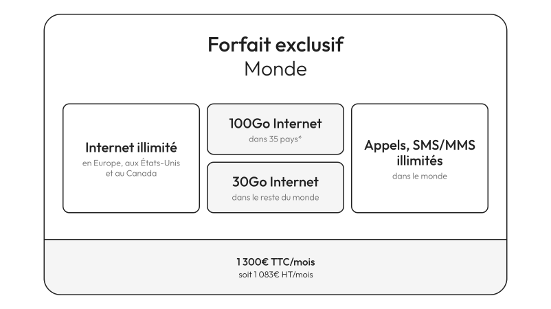Le forfait visé est le forfait Monde de Parnasse, proposé à 1 300 euros par mois. Il inclut notamment internet illimité en Europe, aux États-Unis et au Canada, ainsi qu’une enveloppe de data à l’international dans de nombreuses zones avec 100 Go dans 35 destinations spécifiques : Afrique du Sud, Algérie, Arabie Saoudite, Argentine, Australie, Bahreïn, Bénin, Brésil, Cameroun, Chine, Corée du Sud, Côte d’Ivoire, Égypte, Émirats Arabes Unis, Gabon, Hong Kong, Inde, Indonésie, Israël, Japon, Jordanie, Liban, Madagascar, Mali, Maroc, Maurice, Mexique, Oman, Qatar, Russie, Sénégal, Singapour, Thaïlande, Tunisie, Turquie. Et 30 Go “dans le reste du monde”, sans forcément détailler précisément les autre pays concernés.