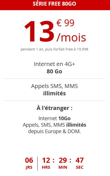 Avec sa dernière Série Free, dévoilée ce mercredi et valable jusqu’au 24 novembre, l’opérateur de Xavier Niel propose 80 Go pour 13,99 euros, avant un passage à 100 Go pour 19,99 euros au-delà de la première année.