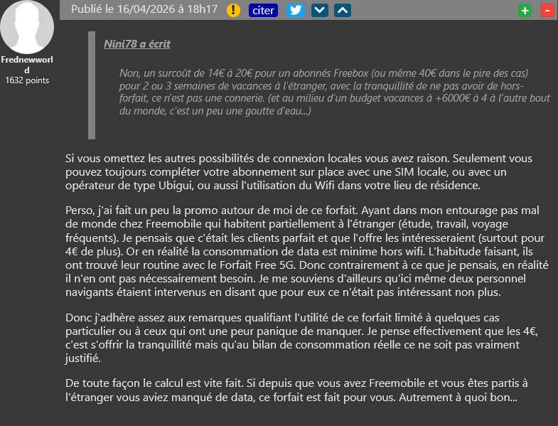 Passer à l’illimité à l’international ou en France, pour les vacances ou pour une période courte, c’est possible chez Free Mobile et les abonnés au forfait 5G+ n’auront pas à garder leur offre plus longtemps que nécessaire. Mais comme depuis le lancement de l’offre, certains continuent de ne pas voir l’intérêt notamment d’un abonnement illimité dans le cadre d’un voyage. Décidément, Free a encore du boulot pour convaincre avec son offre premium, même si plusieurs voient dans sa proposition une possibilité de réel confort.