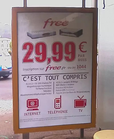 Après les affiches 4 x3 sur toute la France, Free lance une nouvelle campagne d’affichage sur le mobilier urbain. La charte graphique reste la même que celle de son site web. Ces publicités sont cependant beaucoup plus détaillées que les affiches 4 x 3.