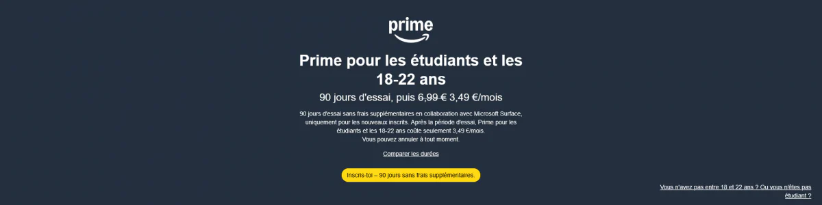 Tous les abonnés Freebox ne sont pas logés à la même enseigne face à Amazon Prime. Si les offres les plus haut de gamme l’incluent directement, ce n’est pas le cas pour les Freebox Pop et Révolution… sauf si vous connaissez cette petite astuce. Amazon propose en effet une offre baptisée Prime Student, qui permet de profiter de tous les avantages de Amazon Prime pour 3,49 €/mois au lieu de 6,99 €, avec en prime trois mois offerts au moment de l’inscription.
