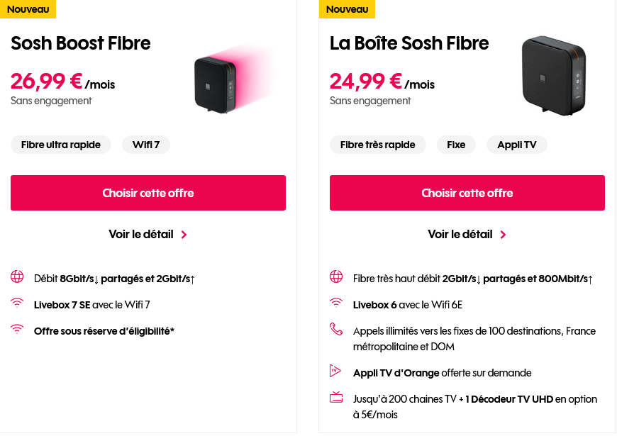 Plus accessible, La Boîte Sosh Fibre est proposée à 24,99 € par mois sans engagement. Elle se concentre sur une expérience fibre complète, en intégrant la télévision mais seulement via une application. Elle comprend ainsi un débit jusqu’à 2 Gbit/s en téléchargement et 800 Mbit/s en envoi (débits partagés) et la Livebox 6 avec WiFi 6E, mais aussi les appels illimités vers les fixes de 100 destinations, dont la France métropolitaine et les DOM, et l’appli TV d’Orange disponible sur demande. Cette dernière permet d’accéder à jusqu’à 200 chaînes TV. Il est possible d’obtenir un décodeur TV UHD en option à 5 € par mois.