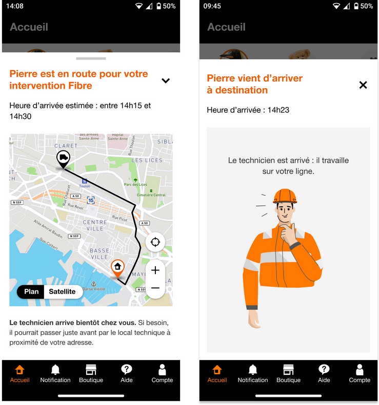 En cliquant sur la notification, l’utilisateur accède à une carte interactive affichant la position du technicien, son prénom, ainsi qu’une estimation précise de son heure d’arrivée. L’application peut également fournir des recommandations pratiques, comme préparer l’installation de la Livebox avant son arrivée.