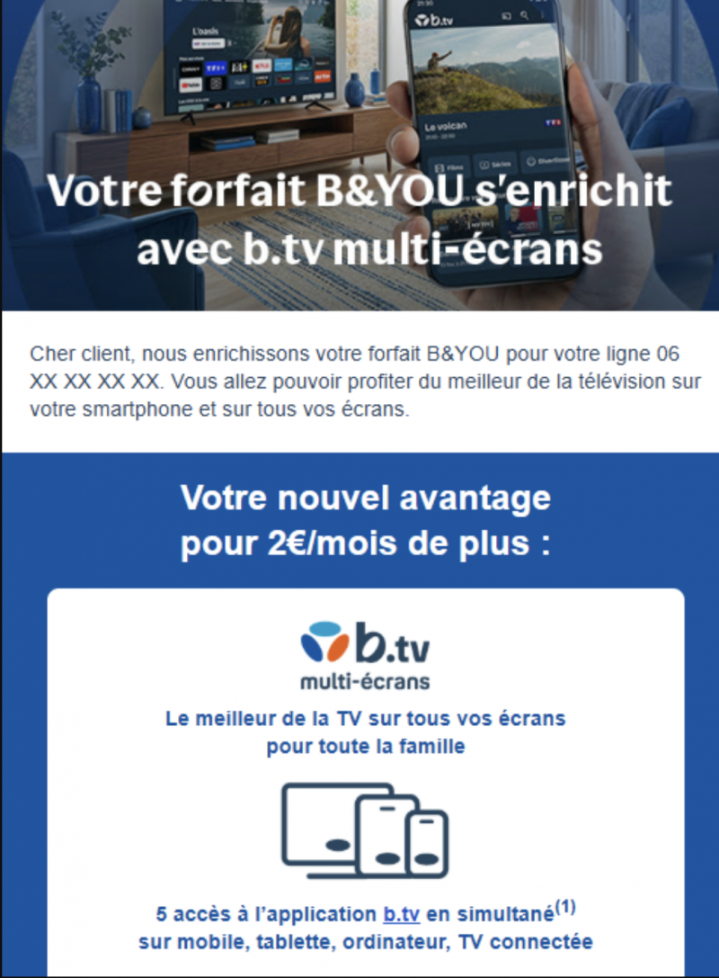 Dans le détail, cette option permet d’accéder à la télévision sur plusieurs appareils en simultané, jusqu’à cinq écrans (smartphone, tablette, ordinateur ou TV connectée). Un usage familial qui existe déjà chez certains concurrents, mais qui devient ici un levier de monétisation supplémentaire. Le mécanisme est désormais bien rodé puisque l’option est ajoutée automatiquement, sans action de l’abonné, avec un premier mois offert. Passé ce délai, la facturation démarre à 2€ par mois supplémentaires, à compter du 13 juin 2026 dans les cas observés. Il est toutefois à noter que cette option déjà lancée pour les abonnés fixe, vient d’être commercialisée cette semaine sur le mobile pour les forfaits Bouygues Telecom 250 Go ou plus, au prix de 4,99€/mois. Il s’agit donc ici d’un avantage  B&You puisque le prix est 2,99€ moins cher.