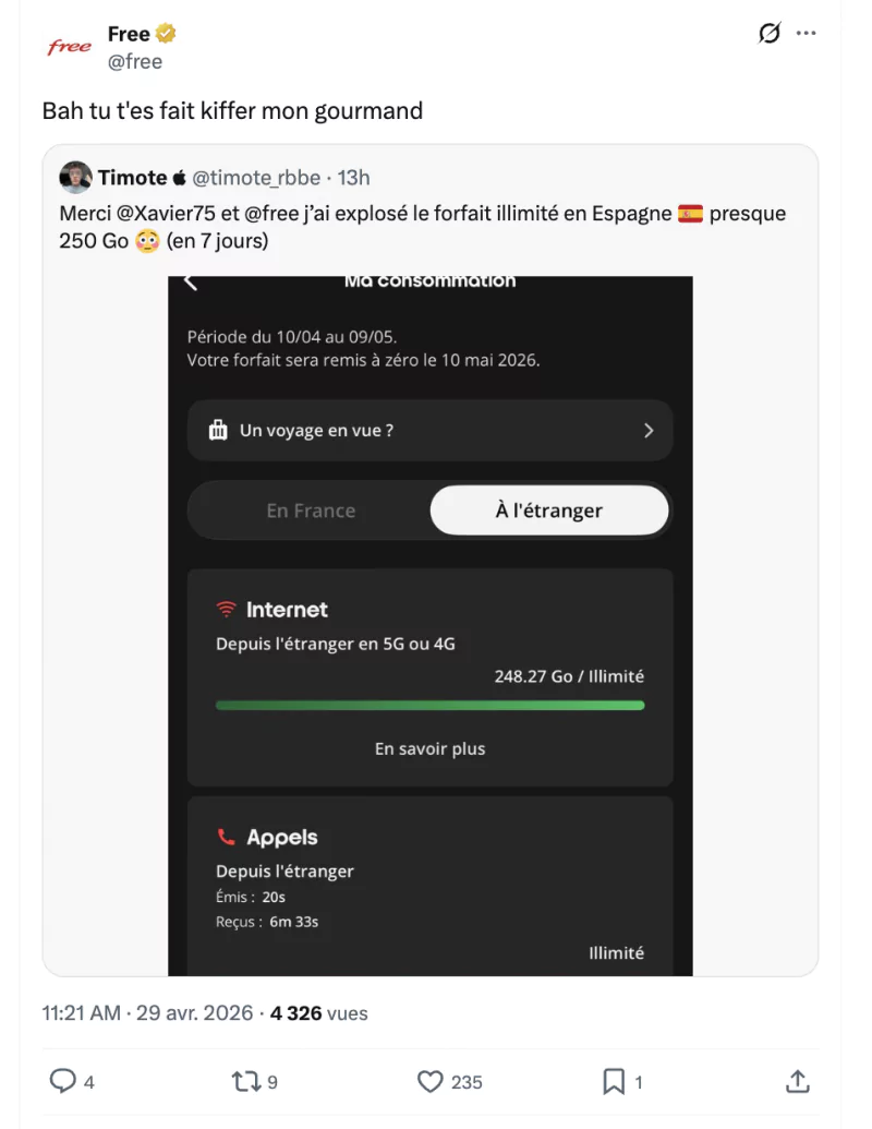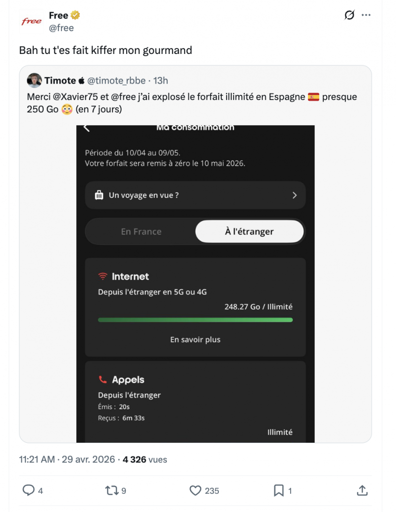 Loin de s’inquiéter d’un tel usage, Free choisit au contraire de le valoriser. En réponse au post de l’abonné, le compte officiel de l’opérateur ironise : « Bah tu t’es fait kiffer mon gourmand ». Une manière assumée de démontrer que l’offre tient sa promesse : il n’y aurait pas de plafond caché, même en roaming. Ce type de consommation était jusqu’ici très rare, voire impossible sans surcoût, dans les forfaits traditionnels. Avec Free Max, l’opérateur donc cherche clairement à casser cet usage limité à l’étranger, en misant sur une expérience sans contrainte ni risque de hors-forfait. Reste à voir si ces usages extrêmes vont se multiplier dans les prochaines semaines. Free semble en tout cas prêt à les assumer, et même à les encourager, pour illustrer le positionnement très offensif de son nouveau forfait.