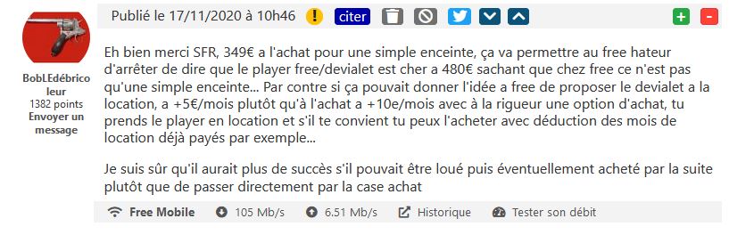 La copie, mais la bonne ! SFR a lancé sa propre enceinte connectée Devialet en option avec ses offres fixe. Si le coût peut permettre de relativiser celui de player Free-Devialet, qui propose plus de services, SFR a tout de même eu une idée plutôt appréciable. En effet, contrairement à son concurrent, l’offre mise en avant est une location du matériel, et non un achat même si celui-ci est possible. Une décision qui aurait peut être pu éviter les critiques envers Free lors du lancement de la Freebox Delta.