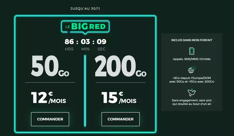Il ne restera pas longtemps en vitrine, et il va falloir se décider rapidement s’il vous intéresse. Red by SFR lance en effet le forfait Big Red pour le Black Friday. Deux formules avec 50 et 200 Go de data sont proposées à respectivement 12 et 15 euros par mois jusqu’au 30 novembre 2020. “Sans engagement, sans prix qui double au bout d’un an”, précise d’ailleurs la marque low-cost de l’opérateur au carré rouge. Ces offres incluent également les appels, SMS et MMS en illimité. Pour la partie roaming, une enveloppe data de 8 Go depuis l’Europe et les DOM est intégrée dans la formule 50 Go. Celle-ci passe à 15 Go avec la version 200 Go.