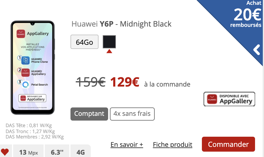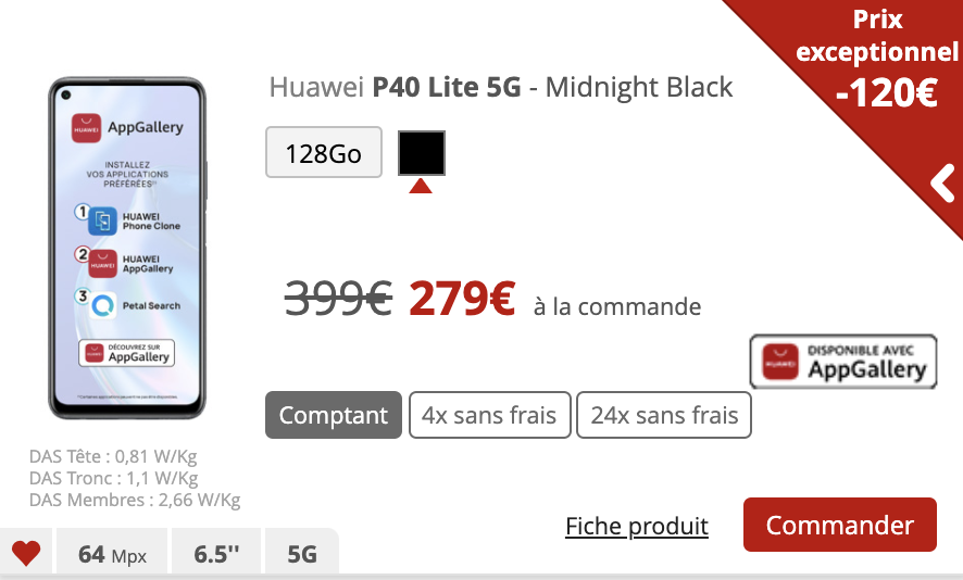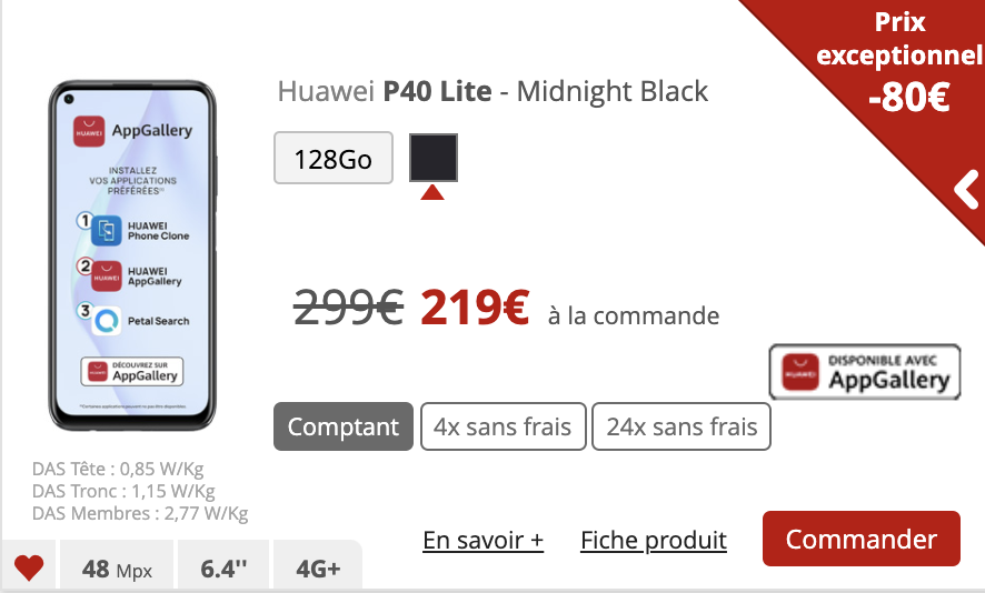 Le Huawei P40 Lite est pour sa part proposé à 219€ en achat comptant soit une baisse de 80€.