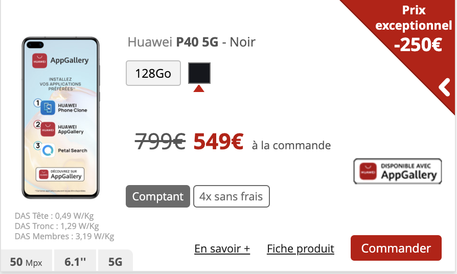 Le Huawei P40 5G quant à lui dorénavant proposé à 549€ au lieu de 799€, soit 250€ de remise contre 220€ jusqu’à présent.