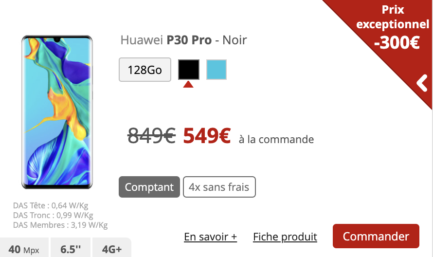 Et ce n’est pas fini, si le Huawei P30 est toujours proposé à 399€ au comptant au lieu de 649€, soit 250€ de réduction, la version Huawei P30 Pro, bénéficie d’un nouvelle promo de 300 €. Son prix est désormais de 549€ à l’achat au lieu de 849€.