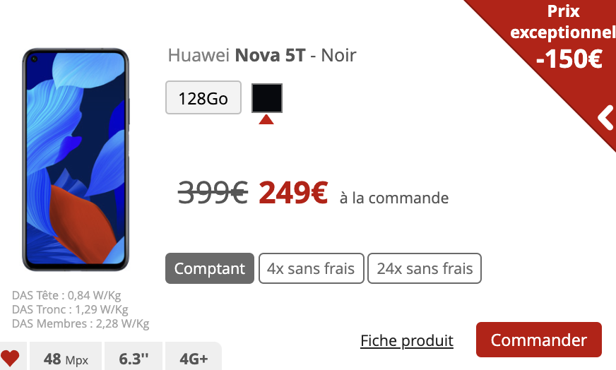 Pour le Huawei Nova 5T, une nouvelle réduction de 150€ apparaît, ce smartphone est affiché à 249€ au lieu de 399€.