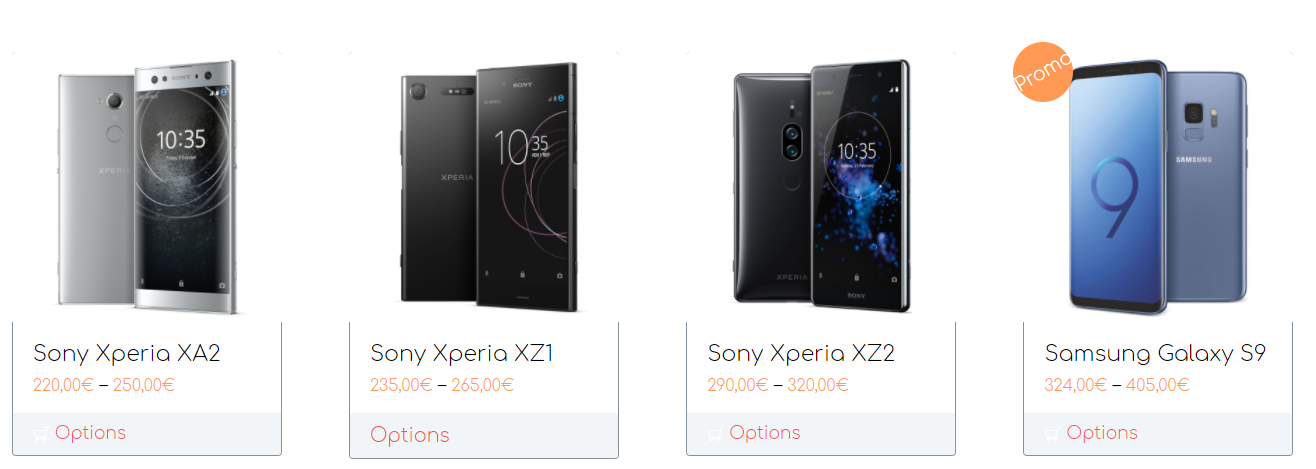 Quatre modèles de smartphones sont disponibles : le Sony Xperia XA, le Sony Xperia XZ, le Sony Xperia XZ et le Samsung Galaxy S9. Chacun de ses smartphones sont proposés avec 3 “grades esthétiques”, le A représentant un excellent état, le B un très bon état et le C un état esthétique satisfaisant. Les prix varient de 220€ à 405€.