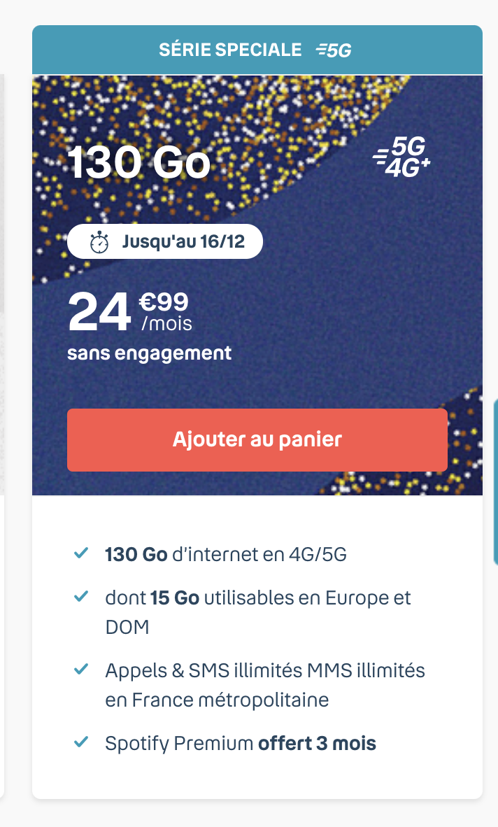 Que la bataille commence ! A l’heure où Orange, SFR et Bouygues Telecom bombent le torse sur le nombre de villes couvertes en 5G au lancement de leur réseau, l’opérateur de Martin Bouygues ouvre le bal des forfaits low-cost. A l’occasion de l’allumage de sa 5G ce matin, celui-ci en profite pour dégainer via sa marque B&YOU, un forfait 5G/4G+ sans-engagement, à 24,99€ euros par mois pour 130 Gigas de données dont 15 Go utilisables en Europe et DOM. Spotify Premium est offert pendant 3 mois.