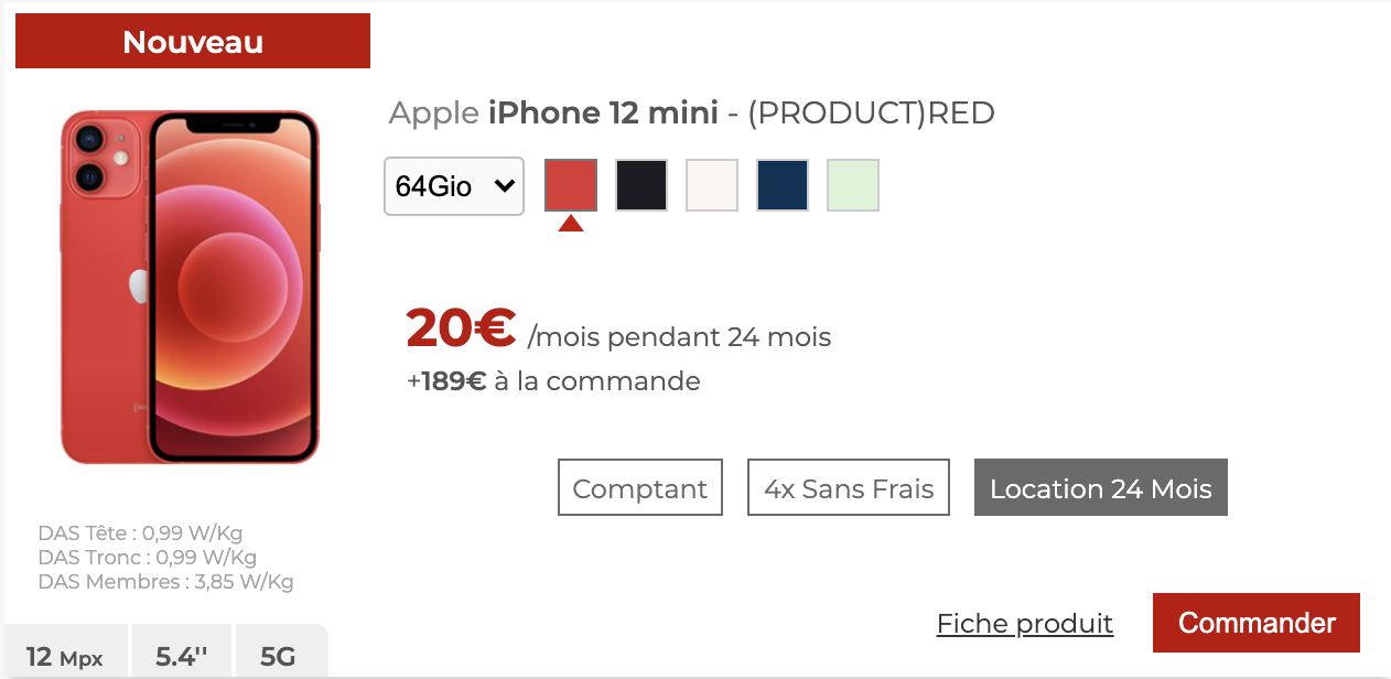 Après l’iPhone XS, XR, 11 et SE, c’est au tour d’un des nouveaux bébés d’Apple d’être proposé en location 24 mois dans la boutique en ligne de Free Mobile. Il s’agit de la version 64 Go de l’iPhone 12 mini, proposé à 189€ à la commande puis 20€/mois pendant 2 ans. A noter que l’iPhone 12 ne bénéficie pas encore de ce mode de paiement.