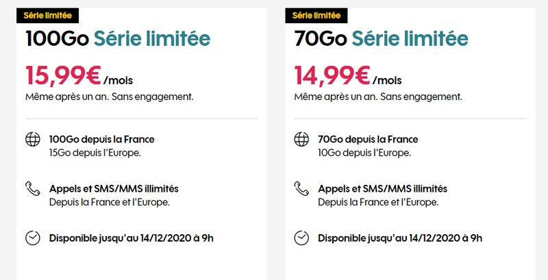 Les deux forfaits Sosh 100 Go et 70 Go en séries limités sont toujours d’actualité sur le site de l’opérateur, sauf que le premier est tombé à 15,99 euros par mois en conservant les appels/SMS/MMS illimité depuis la France et l’Europe, ainsi que les 15 Go en roaming depuis l’Europe.