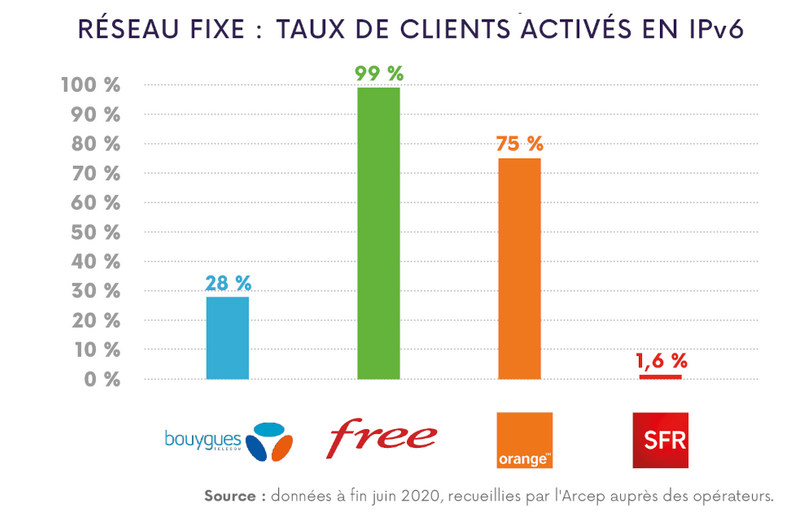 L’Arcep dévoile son baromètre annuel de la transition vers l’IPv6. Free a déjà activé cette technologie pour 99% de ses abonnés fixes mi-2020, et si Orange et Bouygues progressent, SFR quant à lui régresse.
