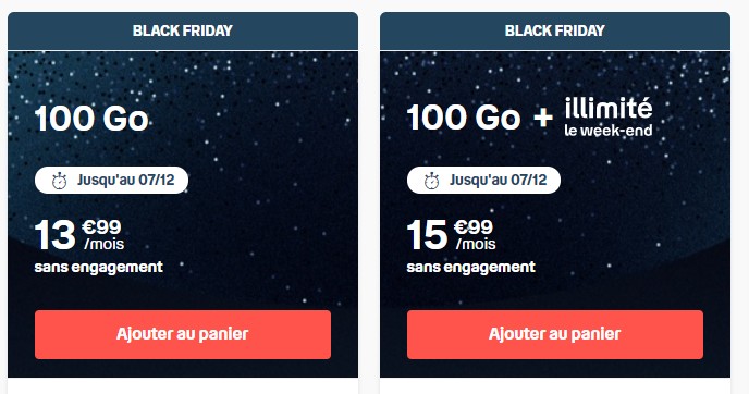 Les autres opérateurs ne se sont pas en reste. Sosh propose une série limitée 100 Go à 14,99 euros jusqu’au 14 décembre. Bouygues Telecom propose des forfaits 100 Go à 13,99 et 15,99 euros jusqu’au 7 décembre. Le second ajoute l’internet illimité le week-end pour un surplus de 2 euros. Chez Free, c’est “seulement” 70 Go à 10,99 euros, avant un basculement vers le forfait 100 Go à 19,99 euros.