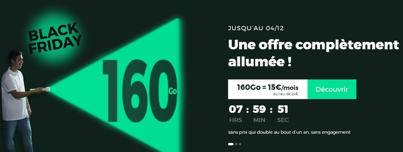 Pour le Black Friday, la marque low-cost de l’opérateur au carré rouge décide de frapper fort. Elle annonce en effet un forfait 160 Go à 15 euros par mois. Pas d’engagement, et pas de prix qui double au bout d’un an, indique d’ailleurs Red by SFR. Le forfait en question comprend par ailleurs les appels, SMS et MMS en illimité. Il prévoit aussi 15 Go depuis l’Europe et les DOM, pour la partie roaming. L’offre est valable jusqu’à ce soir.