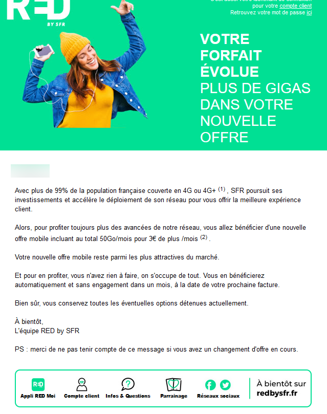 “Plus de gigas dans votre nouvelle offre“, et le refus n’est pas une option. En plus d’une augmentation sur certaines offres fixes, Red by SFR avertit également certains abonnés mobile d’une révision de leur forfait. Pour quelques gigas de plus, ceux-ci devront payer 3€ supplémentaires par mois, sans possibilité de rester sur leur précédente offre.
