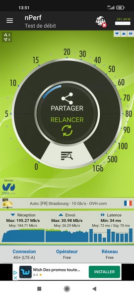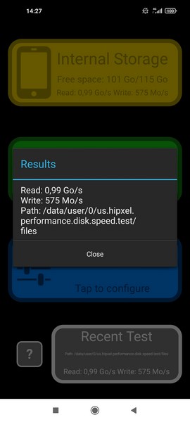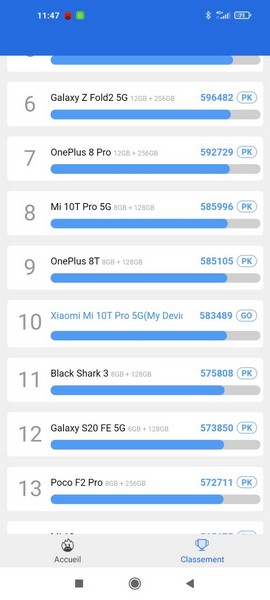 Cette débauche de performances se ressent forcément dans les benchmarks. Disk Speed indique ainsi 575 Mo/s en écriture et 0,99 Go/s en lecture pour la mémoire interne. AnTuTu positionne le Mi 10T Pro en 10e position. Bref, il boxe parmi les meilleurs.