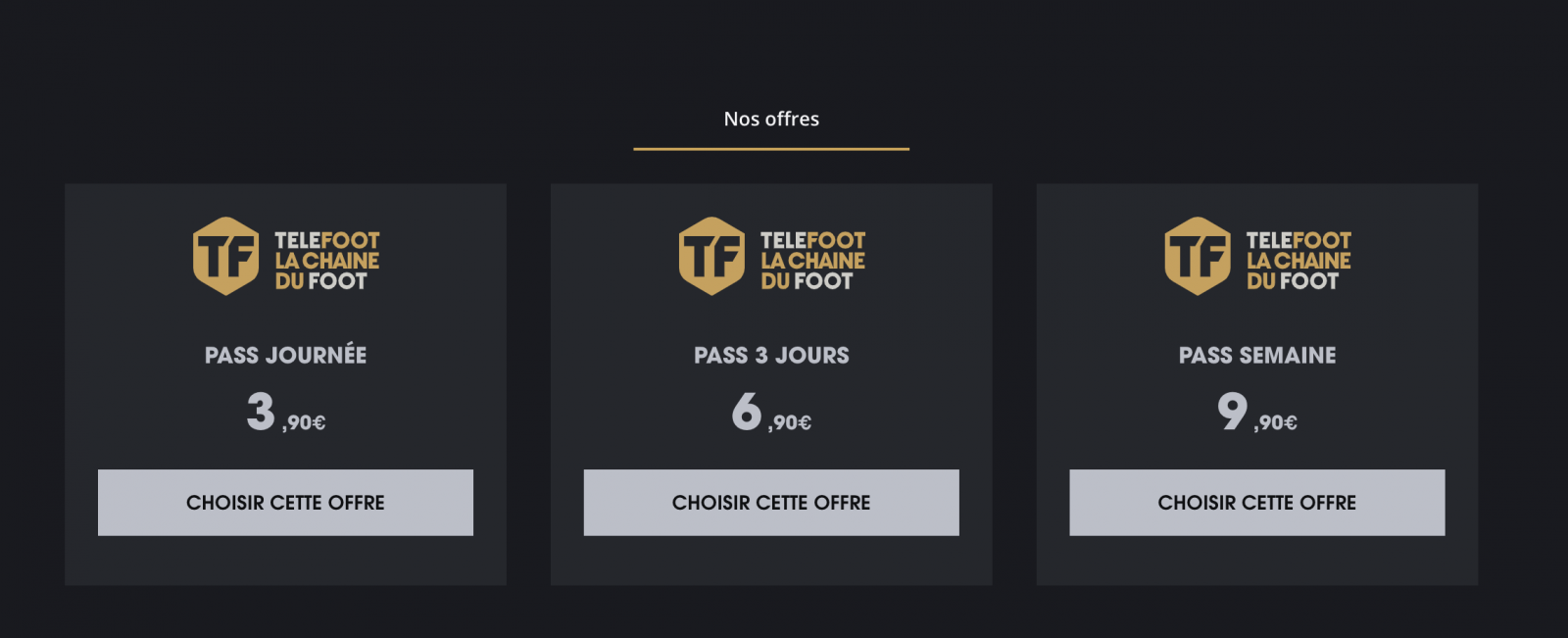 L’accord entre le groupe sino-espagnol et la LFP doit être validé par le tribunal de commerce de Nanterre le 18 décembre. Mais c’est désormais une certitude, la chaîne 100% foot, lancée cet été, cessera prochainement d’émettre. En attendant son arrêt définitif, Téléfoot a modifié ses offres. Exit les abonnements mensuels avec ou sans engagement ou à l’année et place désormais à trois offres à la carte. Sont désormais proposés, un pass journée à 3,90€, un pass 3 jours à 6,90€ et un pass semaine à 9,90€.