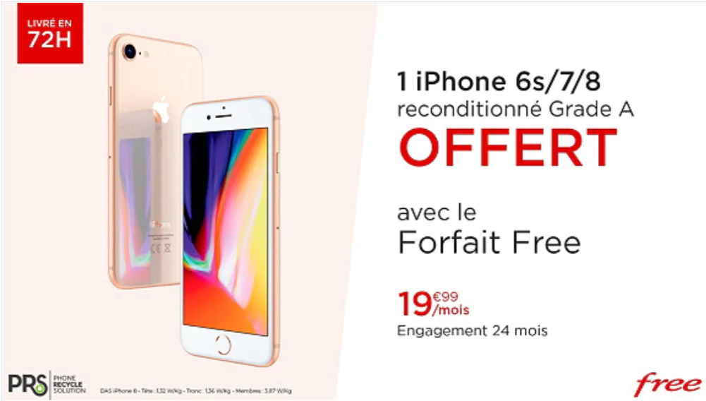 Nous vous l’annoncions ce matin, Free préparait une nouvelle offre spéciale sur Veepee.fr pour ce soir 19h00 . L’horloge a sonné 7 coups, et l’opérateur a dévoilé officiellement cette nouvelle promo qui pour la première, intègre un iPhone 8 64Go. Ce dernier est reconditionné et affiche un Grade A, c’est a dire le meilleur degré de qualité. Il vous sera livré gratuitement (alors que son tarif est normalement de 349€) pour tout abonnement au forfait Free Mobile illimité proposé au tarif habituel, soit 19,99 euros par mois ou 15,99 euros par mois pour les abonnés Freebox (et même 9,99€/mois pour les abonnés Freebox Pop). Cette offre est disponible jusqu’au samedi 19 décembre à 8h00. Mais il vaut mieux être rapide puisque ce genre d’offre peut prendre fin prématurément en cas de succès.