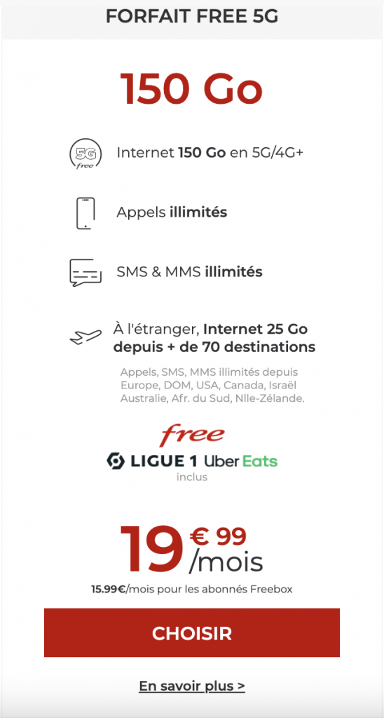 Affiché à 19,99€/mois avec une enveloppe de 150 Go de data, ce nouveau forfait Free 5G est accessible dès aujourd’hui pour les nouveaux abonnés et les clients actuels au Forfait mobile Free, précise l’opérateur. L’enrichissement de leur offre se fera sans surcoût.