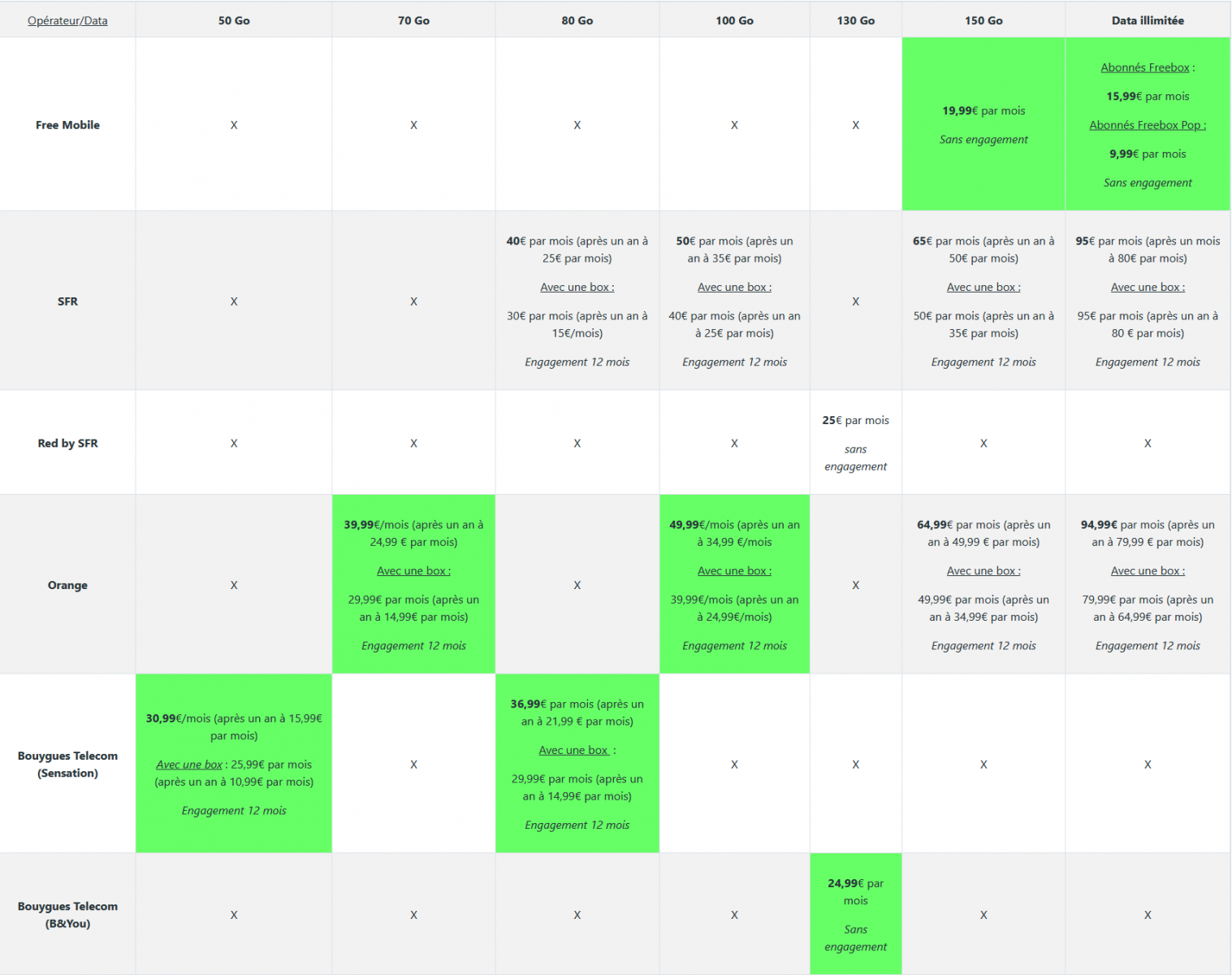 Enfin, les quatre opérateurs proposent chacun au moins un forfait 5G. Si le réseau doit encore être déployé et sa qualité peut varier, une question se pose pour le consommateur : combien coûte un forfait 5G ? Dans ce tableau comparatif, nous vous présentons l’ensemble des offres présentes chez Free, Orange, Bouygues Telecom et SFR, avec ou sans engagement, selon la quantité de data disponible dans chaque offre.