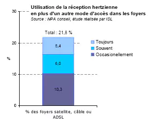 Il en ressort que 21,8 % des foyers équipés de poste(s) satellites, câble ou TV sur ADSL regardent également la télévision par la réception hertzienne sur ce(s) poste(s). 5,4 % des foyers concernés utilisent d’ailleurs la TNT comme unique mode de réception.