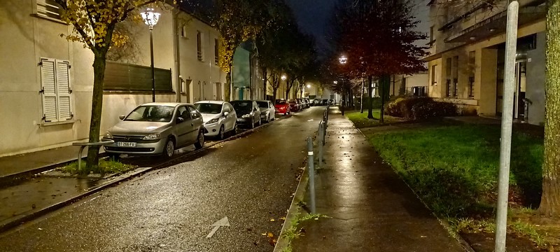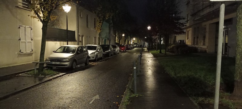 Une photo en extérieur le soir, puis sa version corrigée (jaunie et enrichie à la bouillie de pixels, surtout) par le mode nuit :