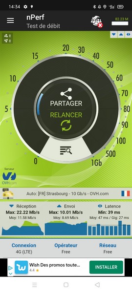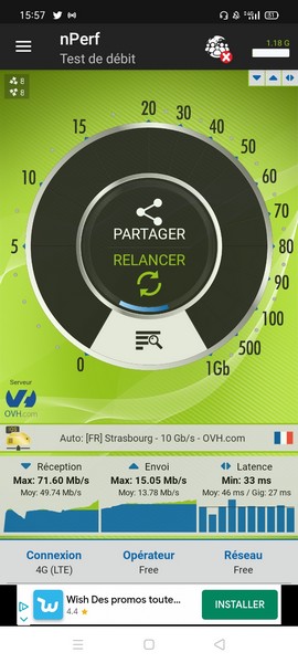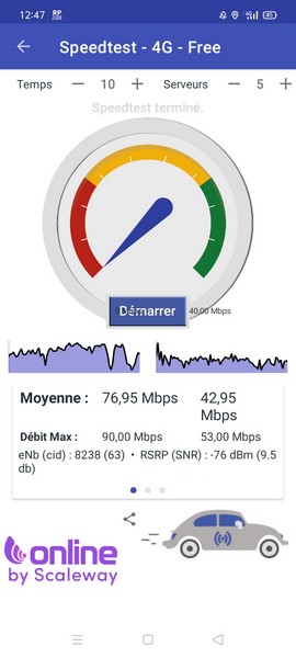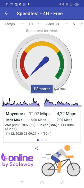 Nous ne sommes jamais montés très haut, même dans les zones biens couvertes où nos effectuons habituellement nos tests de débit. Pas un speedtest à 100 Mbit/s, malgré de nombreuses tentatives.