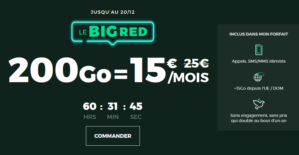 La 5G chez Red n’aura duré que 2 jours. La marque low-cost de SFR a proposé mardi dernier, en même temps que Free, un nouveau forfait 5G, avec 130 Go de data en 5G, pour 25€ par mois. Cette série limitée, prévue pour durer jusqu’au 21 décembre a pris fin rapidement. Une autre offre exclusivement 4G : le “Big Red”, à 200 Go pour 15€ par mois est dorénavant proposée par l’opérateur.