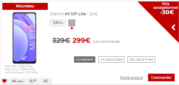 Suite à la mise à jour de la boutique Free Mobile, une nouvelle promotion est apparue. Elle concerne le Xiaomi Mi 10T Lite Gris 128Go, un smartphone 5G qui a fait son apparition il y a 15 jours chez l’opérateur. La remise est de 30€ ce qui porte le tarif de 329€ à 299€ en paiement comptant. La promotion s’applique également sur le paiement en 4 fois sans frais : 77€ puis 74€durant 3 mois mais aussi sur le paiement en 24 mensualités sans frais 107€ puis 8€ durant 24 mois