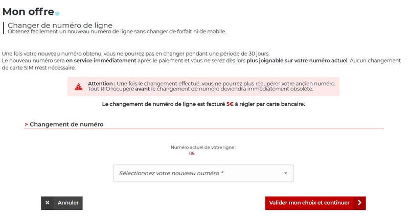 En seulement quelques clics, vous pouvez ainsi choisir un nouveau numéro parmi une liste de dix. Il vous en coûtera 5 euros à régler par carte bancaire. Aucun changement de carte SIM n’est nécessaire. Notez que vous ne pourrez pas changer à nouveau de numéro avant une période de 30 jours ni récupérer votre ancien numéro une fois le changement effectué.