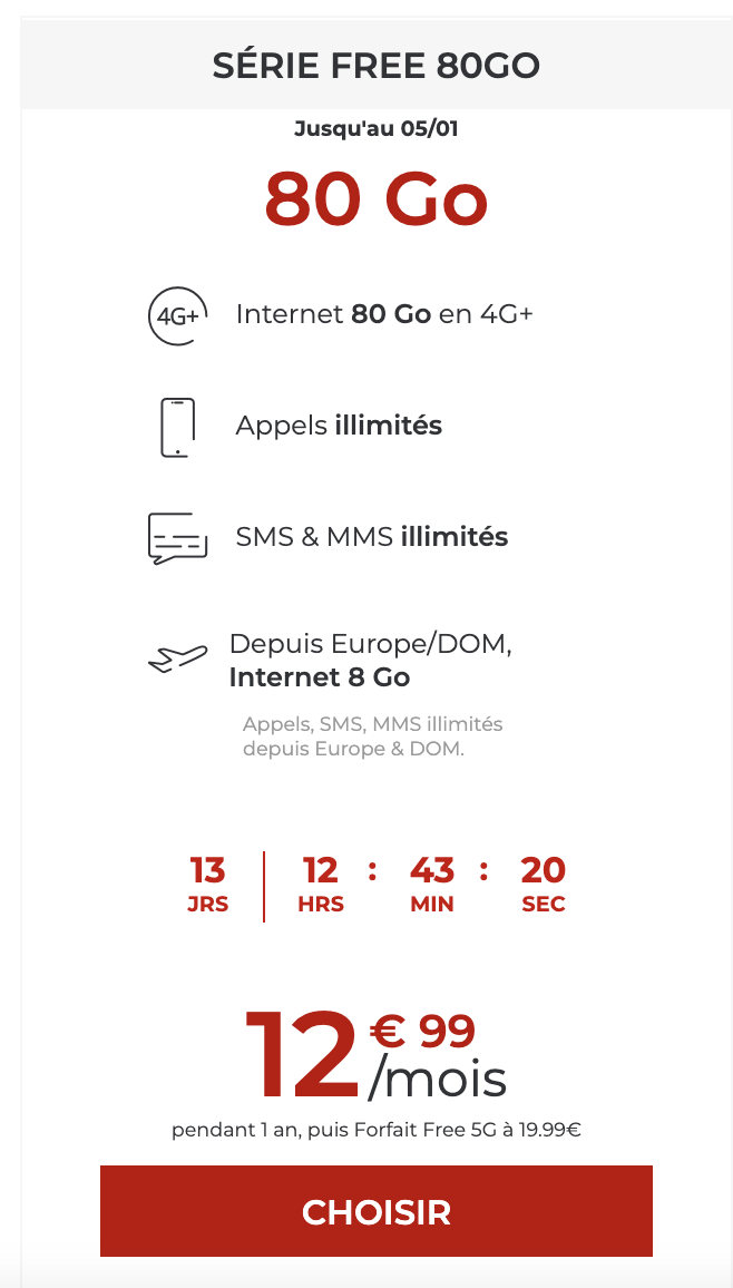 A titre de comparaison, Red by SFR propose actuellement un forfait 4G 80 Go à 15€/mois. Sosh, la marque d’Orange, tente de séduire avec une série limitée 80 Go à 15,99 euros par mois. Enfin, Bouygues Telecom affiche un forfait 80 Go à 14,99 euros par mois.