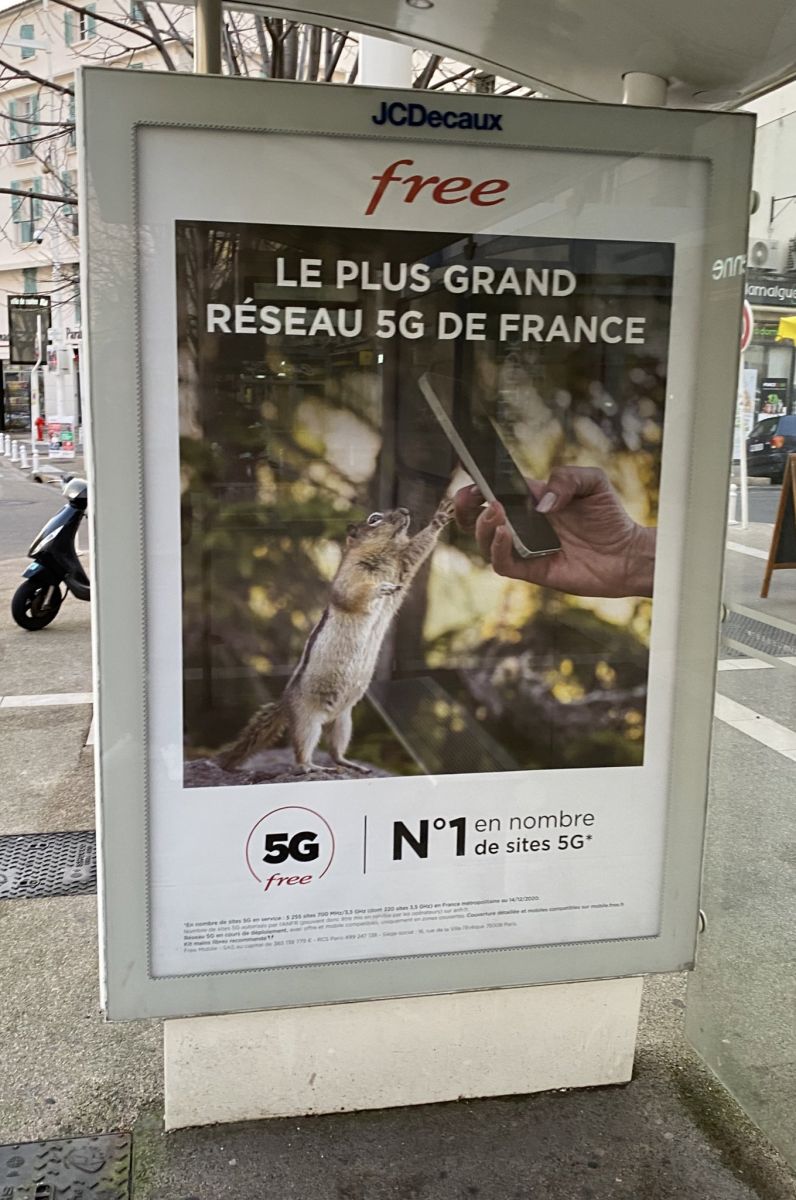 L’opérateur de Xavier Niel promeut sa 5G, annonçant sur le mobilier urbain proposer le “plus grand réseau 5G de France”.
